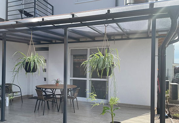 • Polikarbonát: A legnépszerűbb választás. Könnyű, ütésálló, UV-védett, és különböző vastagságban és színben (víztiszta, bronz, opál) kapható. Lehet tömör vagy üregkamrás.